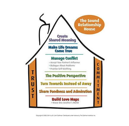 The specific content of the sessions is specifically attuned to the couples needs and goals considering their different levels in the Sound Relationship House (see below).